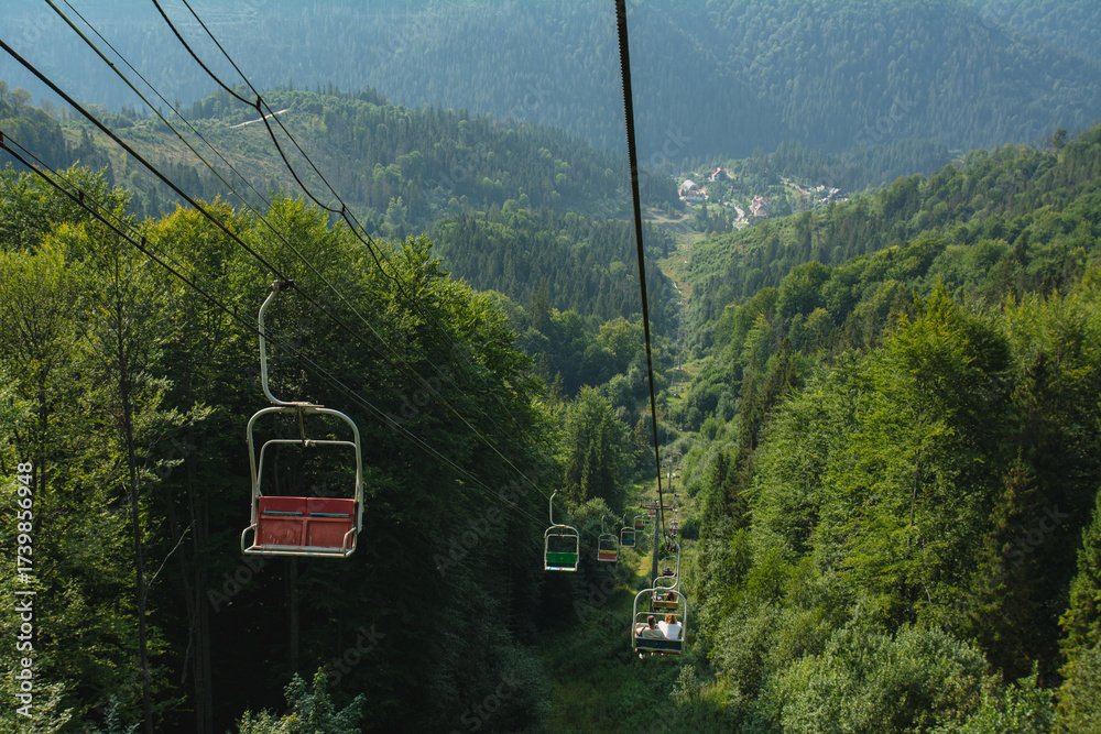 A cable car lift in the mountains in summer: a concept for travel, hiking, and ski tourism