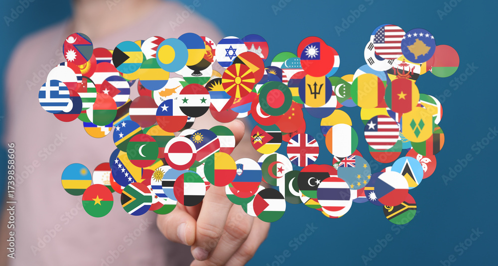 A person's hand holding a collection of world flags, representing global cooperation, international relations, and the concept of a unified worl