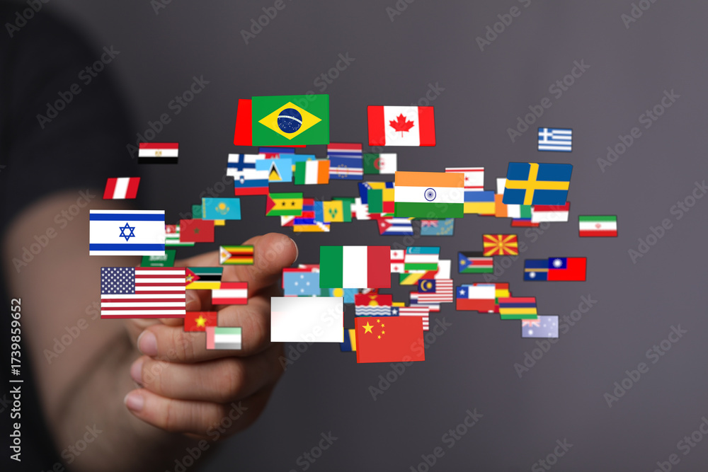 A hand pointing to floating national flags, symbolizing global connection, unity, and travel. Perfect for illustrating diversity, international
