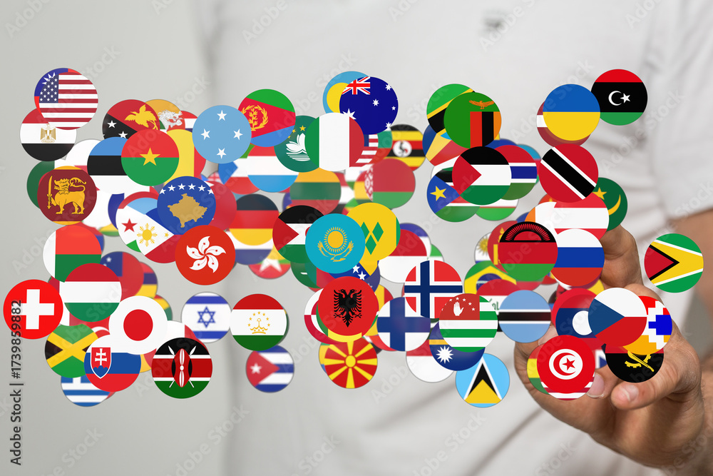 Person's hand interacting with various country flags symbolizing global unity, international relations, and diversity. Represents global harmony