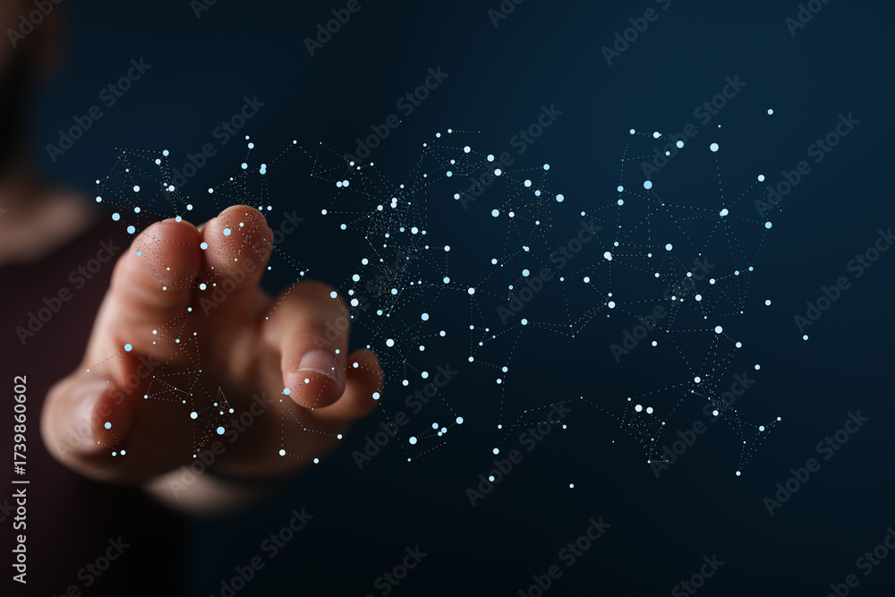 Abstract image of hand interacting with digital network. Ideal for technology, connection, and innovation concepts.