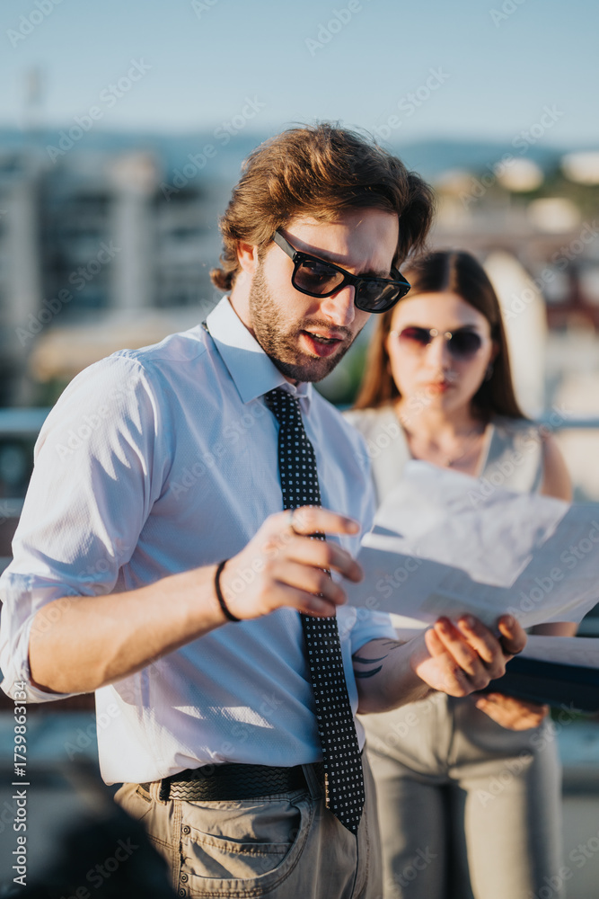 Two business people on a rooftop exchanging ideas and examining documents during sunset. The individuals are dressed in formal attire, fostering a collaborative and focused work atmosphere.