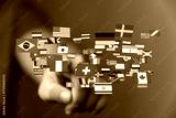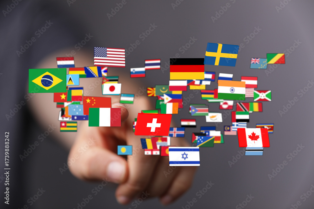 Person's hand with various national flags, symbolizing global cooperation, international relations, and diversity. Perfect for concepts of trave