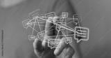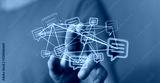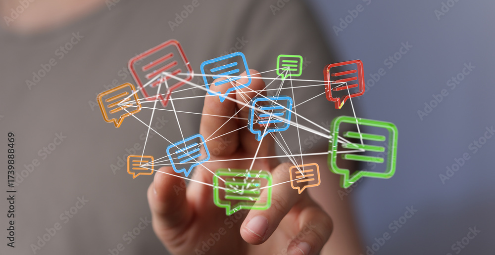 Hand touching a network of chat bubbles representing online communication, social media, and digital connections. Illustrating the concept of me