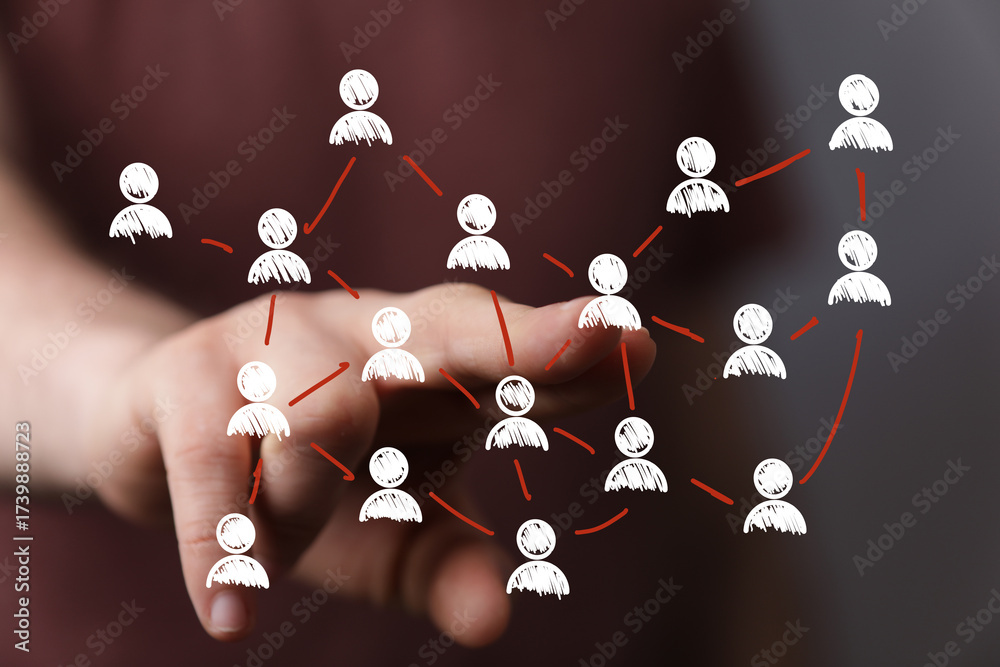 Hand interacting with a network of people, symbolizing connection, collaboration, and social media.