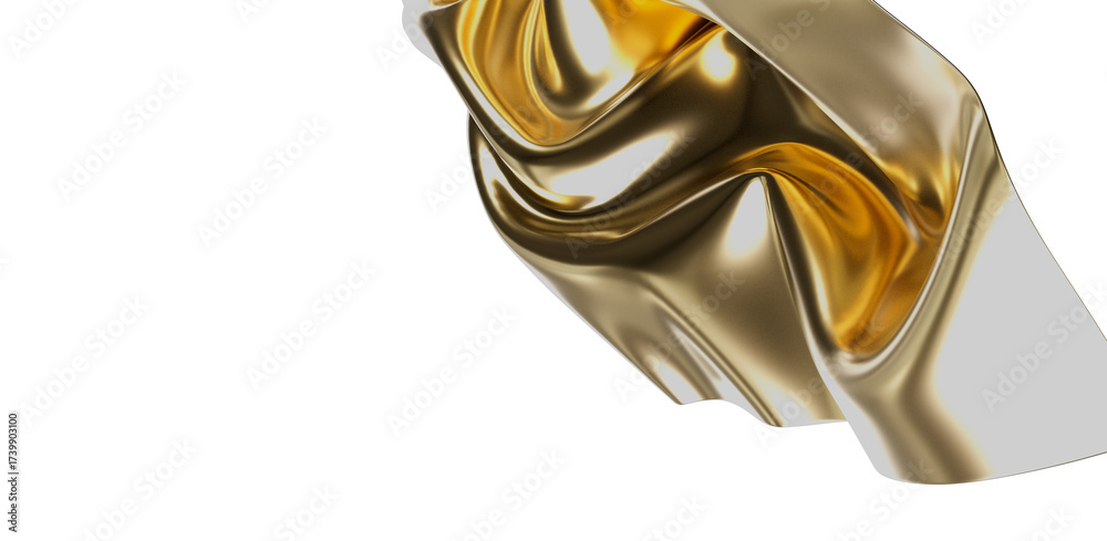 Abstract golden fabric detail with graceful waves isolated on a clean white backdrop, perfect for luxury or design-related visuals.