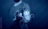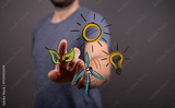 Sustainable energy concept. Hand interacting with digital icons of sun, plant, wind turbine, and lightbulb.