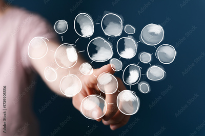 Hand interacting with a digital mind map. Network, connection, idea, innovation, strategy, technology, planning, teamwork, growth, soluti