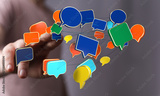 Concept of modern digital communications and online discussion illustrated with bubbles above a hand. Perfect to show dialogue and community.