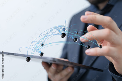 Image of a businessman interacting with a digital network on his tablet. Perfect for technology, connection, and global business concepts