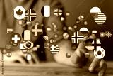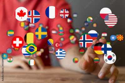 Hands touching floating flags representing countries. Concept of global connections, international community, diversity and travel. Showing glob