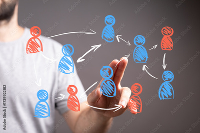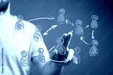 A hand interacts with an abstract digital display showing a network of connected people icons, symbolizing social, business, and data connection
