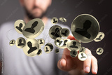 Man touching futuristic network with interconnected profile icons, representing digital networking and teamwork. Collaboration and connection co