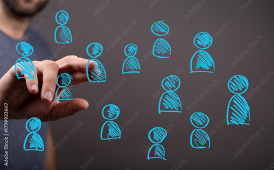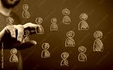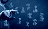 A human hand engages with a digital network of blue person icons, symbolizing social connections, human resources, and business community buildi