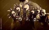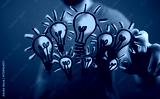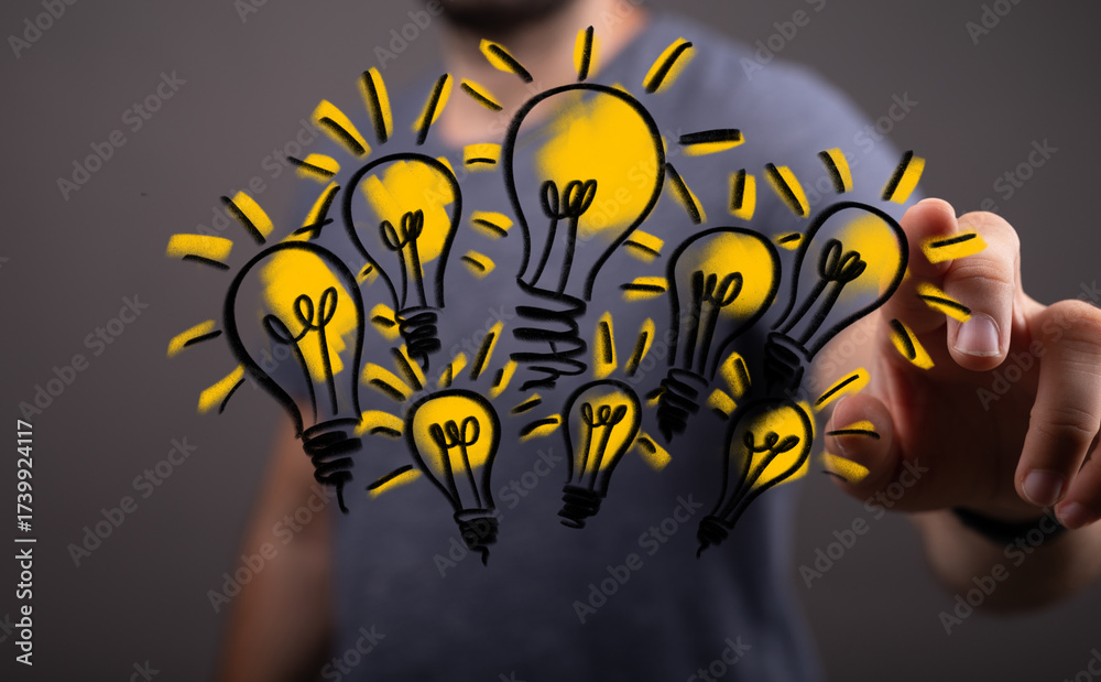 Illustration showing person pointing at a group of glowing light bulbs representing ideas, creative thinking, and brainstorming. Concept of inno