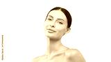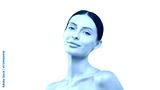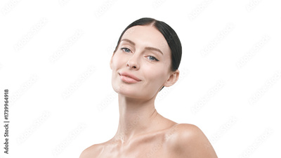 A portrait of a woman with dark hair and clear skin, showcasing a flawless complexion against a bright white background, highlighting natural beauty and elegance.