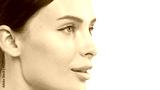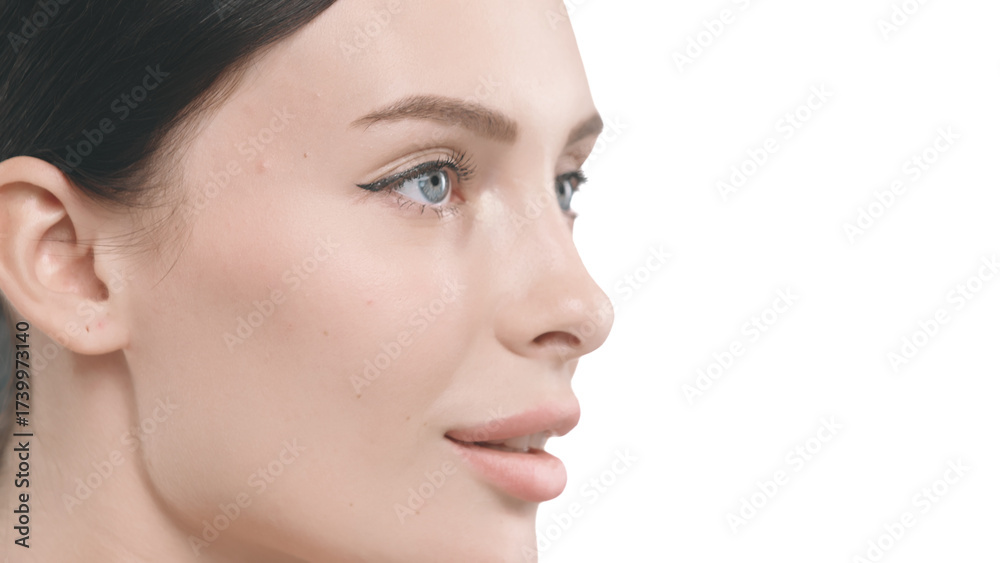 A portrait of a woman with dark hair and clear skin, showcasing a flawless complexion against a bright white background, highlighting natural beauty and elegance.