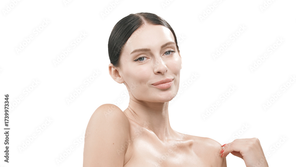 A portrait of a woman with dark hair and clear skin, showcasing a flawless complexion against a bright white background, highlighting natural beauty and elegance.