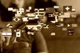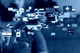 A hand interacting with a digital display of various country flags. Symbolizing global connections, international business, travel and communica