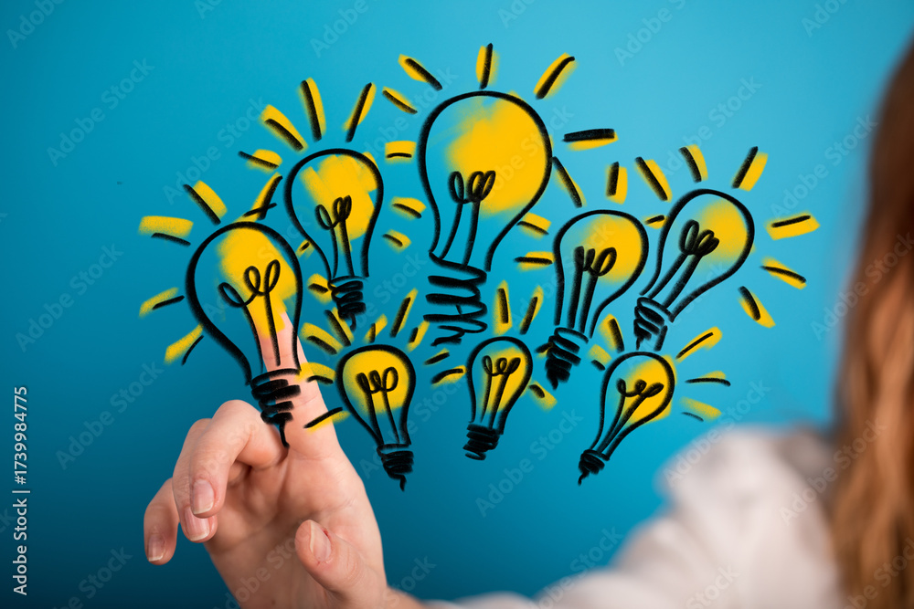 Hand pointing at glowing light bulbs,innovation, creativity, ideas, solution, success, inspiration, teamwork, brainstorming, technology,