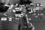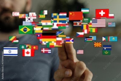 A person's hand touching various country flags, symbolizing global communication, international unity, and interconnectedness. Perfect for conce