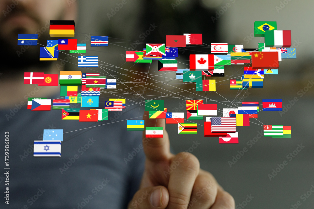 A conceptual image featuring a hand pointing towards a network of connected flags representing international cooperation and technology. Great f