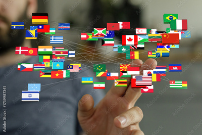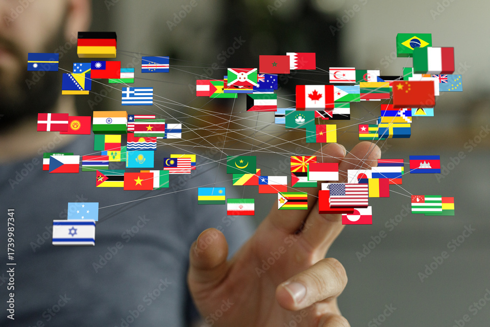A conceptual image representing global connection, international relations, and communication. Featuring 3D flags of different countries linked
