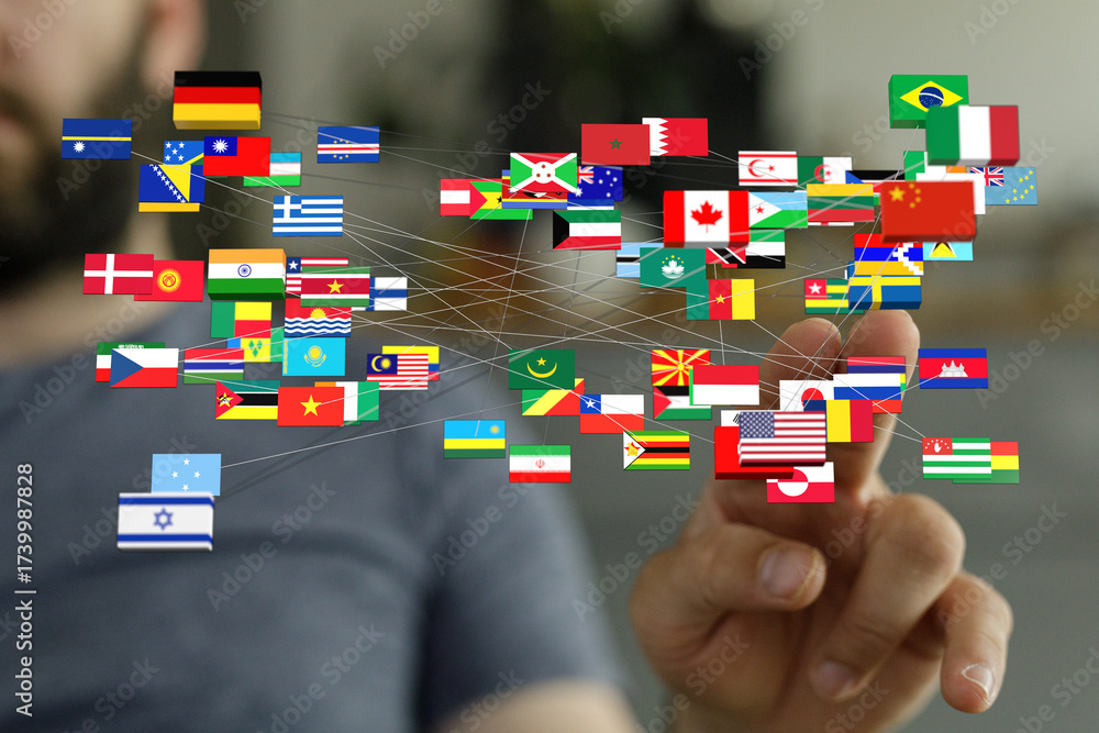Conceptual image representing international relations, global connections, and cooperation. Features a hand interacting with 3D flag icons, symb
