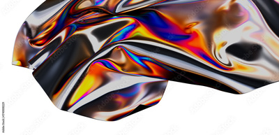 Dynamic abstract image features fluid forms with glossy reflective surface and vibrant iridescent colors creating modern art.