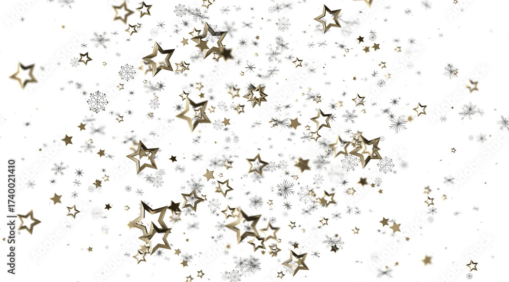 Sparkling gold stars and snowflakes on white. Perfect for holidays, celebration, and winter themes.
