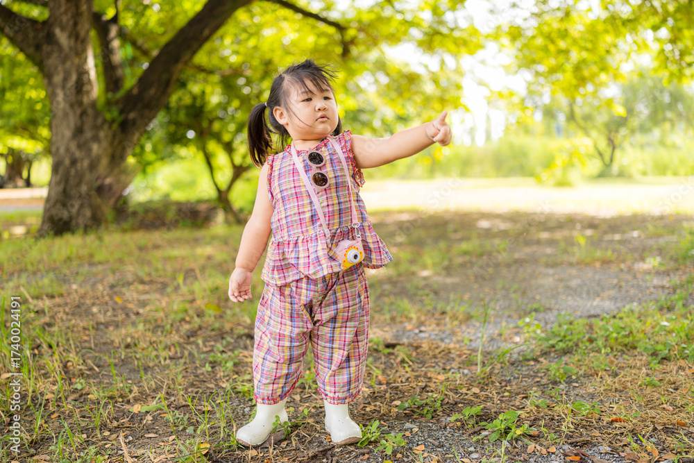 A cute little Asian girl is pointing her finger forward in a park,Young girl in the woods pointing,beautiful little girl in park happy pointing on free space for text