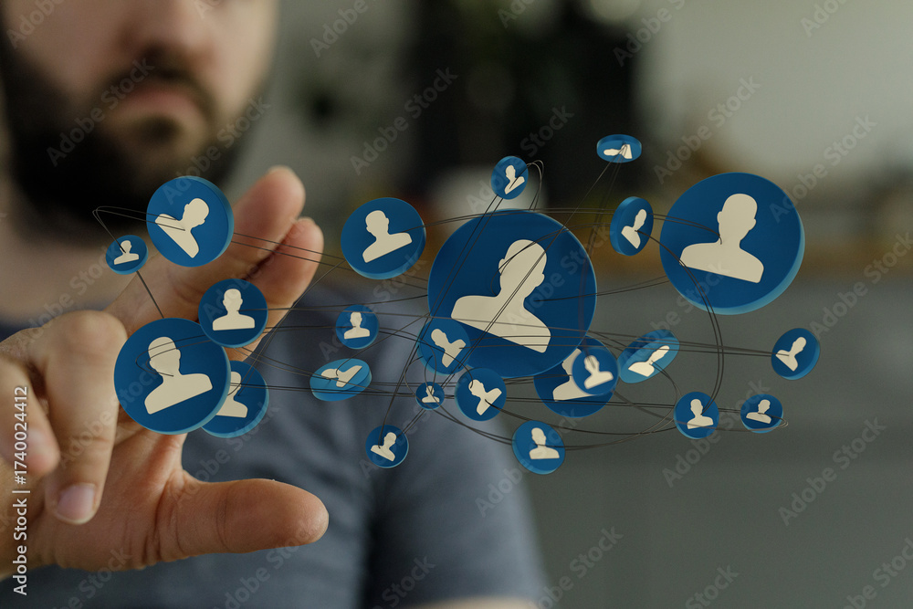 Man interacting with a digital network of profile icons, symbolizing social connection and networking opportunities.