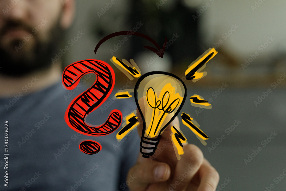 Man discovers solution, innovative idea, problem solving, question, answer, lightbulb, inspiration, creativity, innovation, business, tech