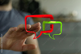 Communication concept image. Social networking shown by hand gesture and speech bubbles in vibrant red and green. Technology metaphor.