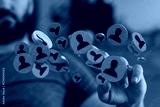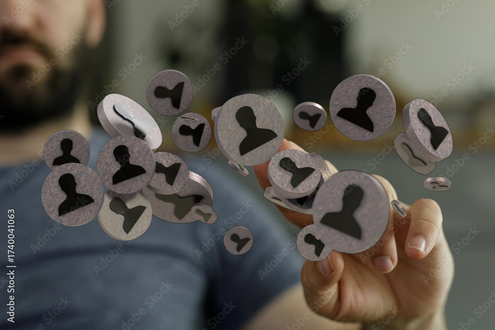 A man interacts with digital avatars. Illustrates social media, human connection, networking in business and personal contexts.
