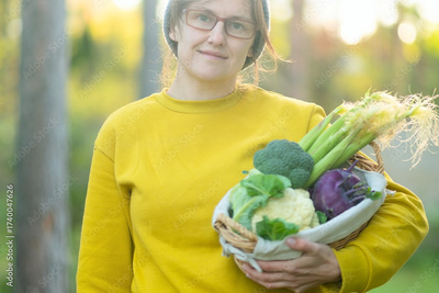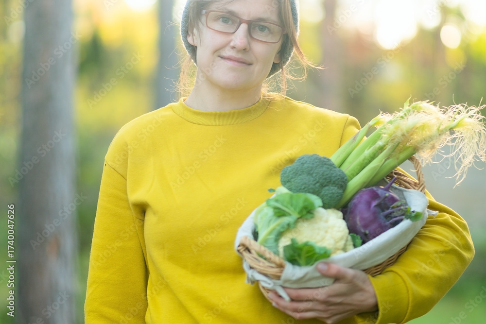 Happy female farmer carrying basket with broccoli, cauliflower, kohlrabi, young corn. Autumn harvest, healthy eating, farming lifestyle, organic produce, nutrition, agronomist work and growth.