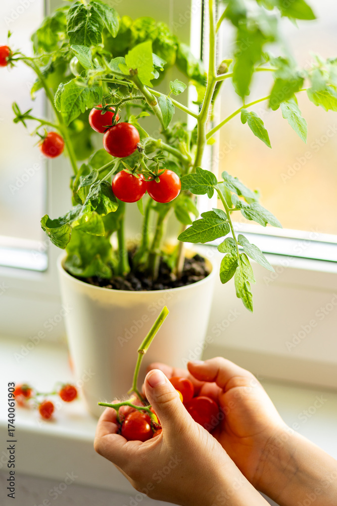 Earth day concept. Little kid growing cherry tomatoes at home on the windowsill. Concept of ecological education at school and kindergarten, eco friendly lifestyle, organic food. Hobby, leisure time