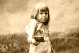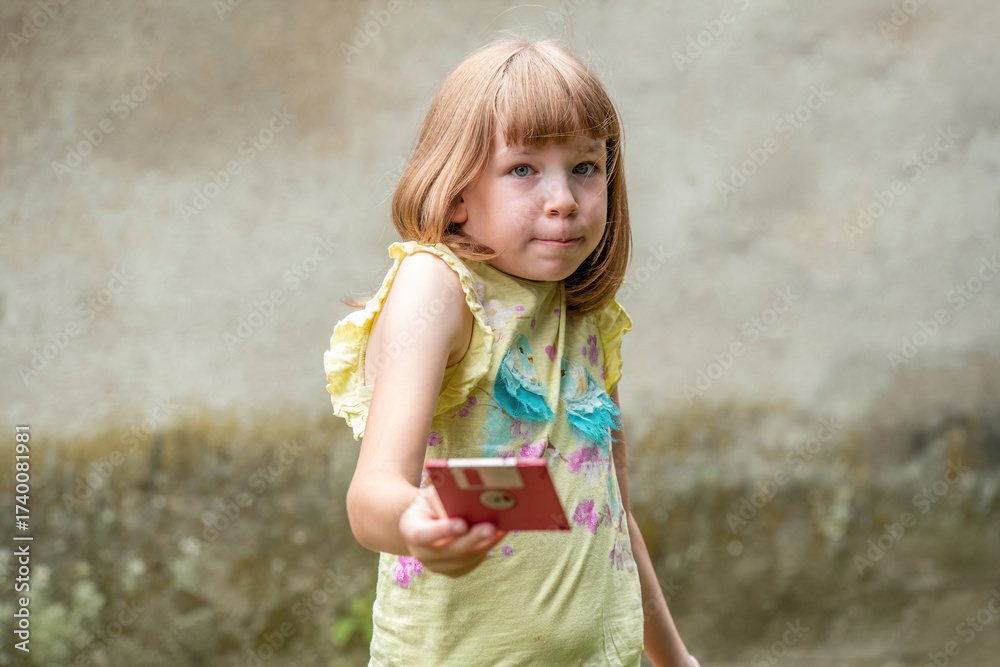 Young girl holding a floppy disk outdoors, puzzled about old computer storage devices, concept of obsolete technology and generation gap, child showing retro media, tech knowledge education concept