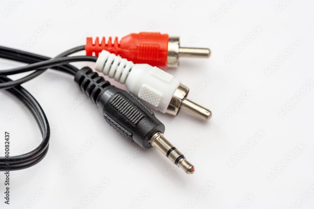 RCA to 3.5mm jack audio adapter cable with red and white plugs and black stereo mini jack isolated on white background, analog sound connector end closeup, music equipment, home audio setups concept
