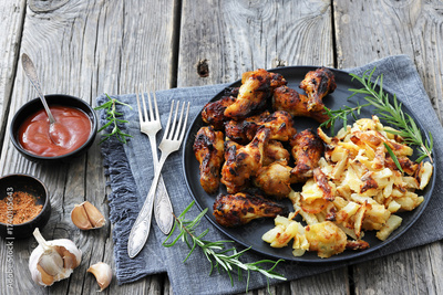 bbq chicken wings with fried potatoes on plate