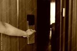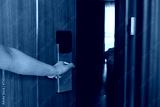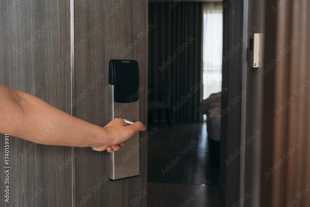 Electronic card key for open door in hotel. Smart card key to lock and unlock door. Security systems and protection concept.