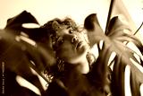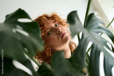 Woman with red hair among monstera leaves