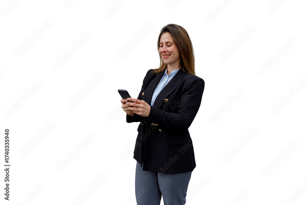 Smiling businesswoman interacting with smartphone, texting and communicating, standing in business casual attire
