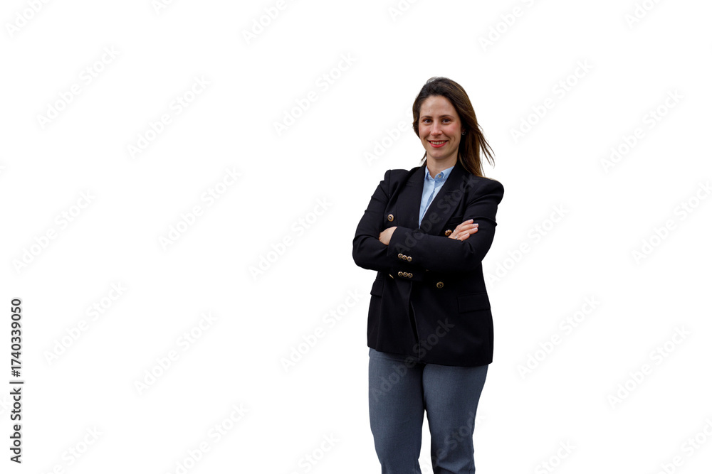 Businesswoman standing with crossed arms, smiling confidently, representing professionalism and success on a transparent background