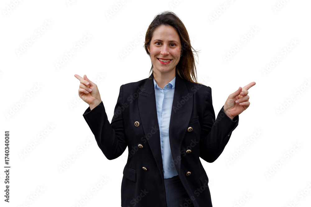 Businesswoman pointing fingers choosing direction, smiling confidently, indicating options, transparent background