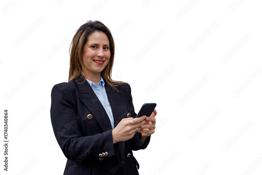 Professional woman smiling, holding smartphone, checking messages, communicating, on transparent background