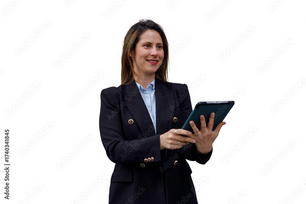 Businesswoman smiling, holding digital tablet, working and communicating with technology, transparent background