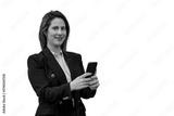 Businesswoman smiling and using mobile phone for communication, technology, and corporate connection on transparent background