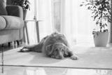 A Nova Scotia Duck Tolling Retriever stretches out on a bright white rug with its legs extended and head down, next to a beige sofa.