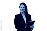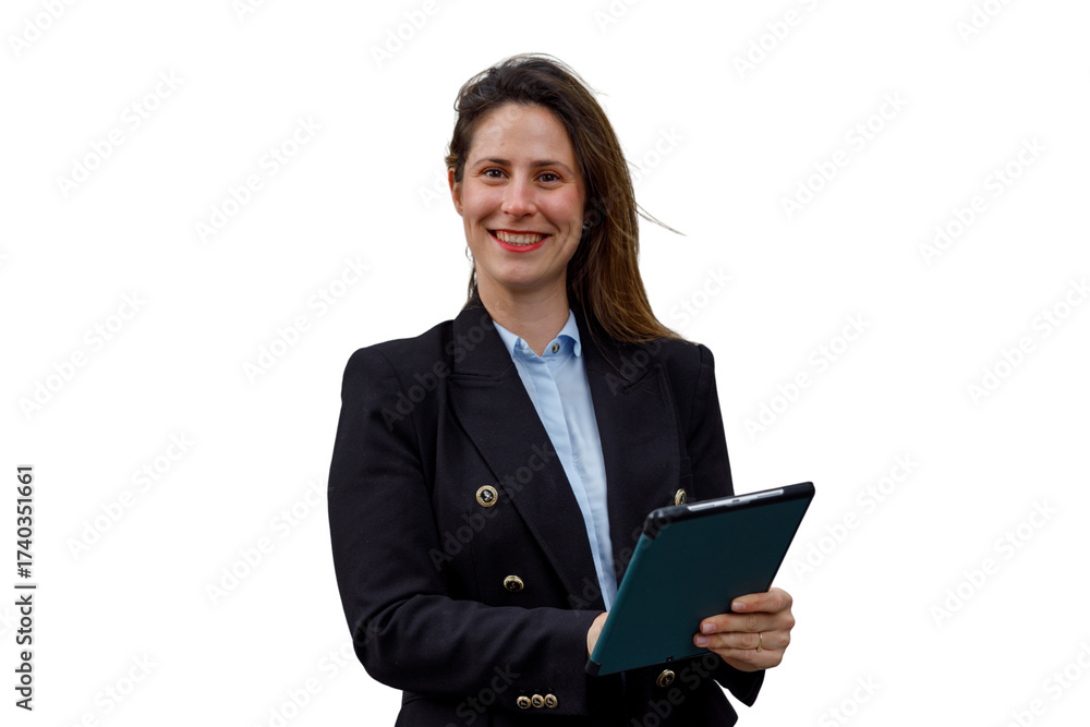 Smiling businesswoman holding a tablet, looking at camera, representing business, technology, and success on transparent background